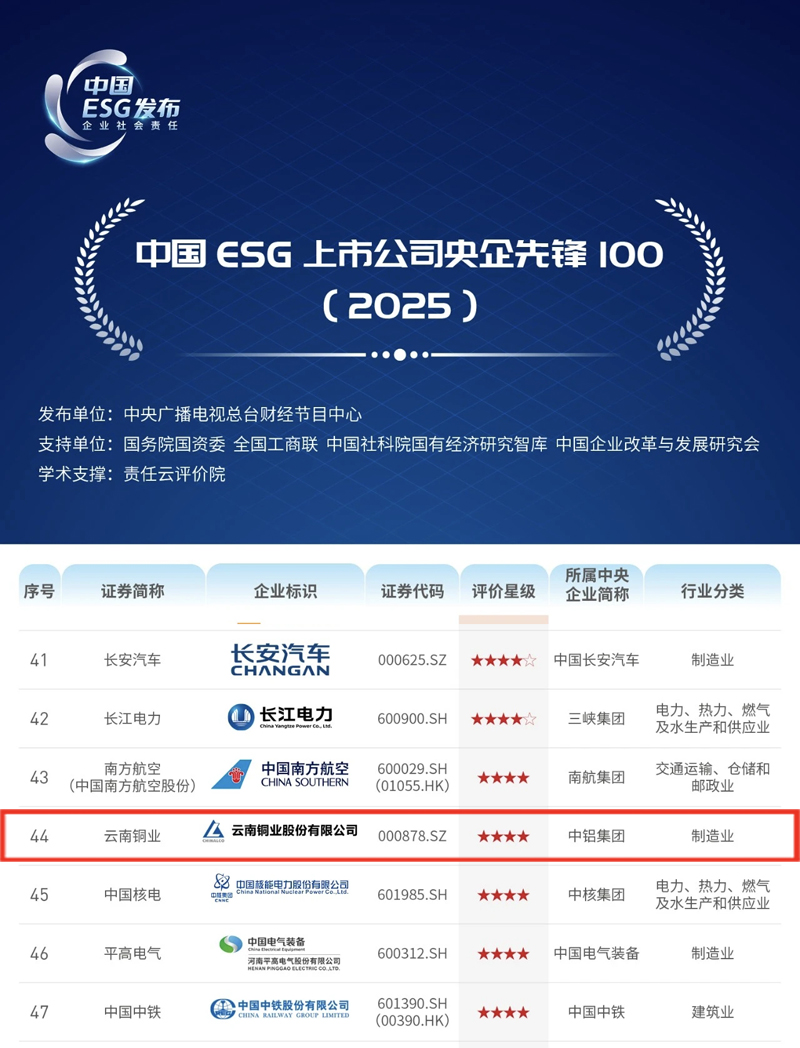 此次双榜入选,是云南铜业继2023-2024年连续四年入选“央企ESG·先锋100指数”后的又一突破。未来,云南铜业将紧扣“双碳”目标,加速推进绿色低碳转型,提升核心竞争力,为建设世界一流优秀铜业公司注入持久动能。(刘锴)